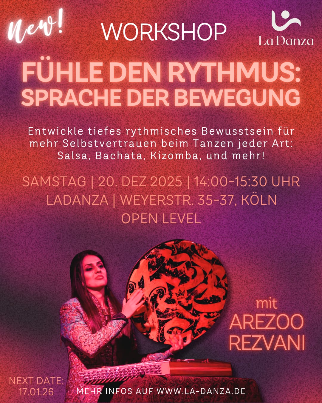 Am Samstag 20. Dezember tauchen wir ein, unter der Leitung von Areezo Rezvani, in den Rythmus der Musik als Sprache und Bewegung!⚡️ Rhythmus ist die Grundlage jeder Musik und jedes...