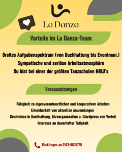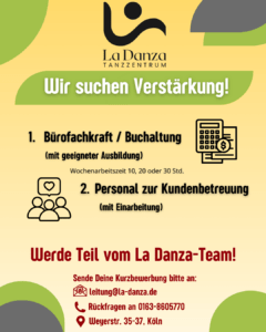 Wir möchten unser Organisationsteam verstärken und suchen für die Bereiche Buchhaltung, Eventmanagement, Kursorganisation und Kundenbetreuung engagierte und zuverlässige Mitarbeiter/innen. Die Begeisteurung für das Tanzen ist KEINE Voraussetzung. Wir legen Wert auf gute Kommunikation und ergebnisorieniertes Arbeitsumfeld. Wir freuen uns auf Deine Kursberwerbung an leitung@la-danza.de oder Deinen Anruf.